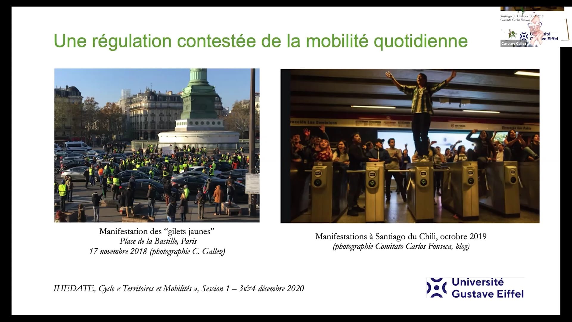 Territoires et mobilités 2020-20214 décembre 2020Vies mobiles, justice sociale et transition écologique Nos sociétés sont confrontées à une urgence écologique qui appelle la mise en place de stratégies de régulation volontaristes des activités les plus émettrices de gaz à effet de serre, dont le transport et la mobilité. Or, dans un contexte où la mobilité joue un rôle crucial dans la participation à la vie sociale, toute augmentation du coût des déplacements produit des effets inéquitables. Nous explorerons l’origine de ces contradictions, afin de réfléchir aux possibilités d’un changement de vision, qui passerait du droit à la mobilité à l’équité d’accès à la ville et à ses ressources.